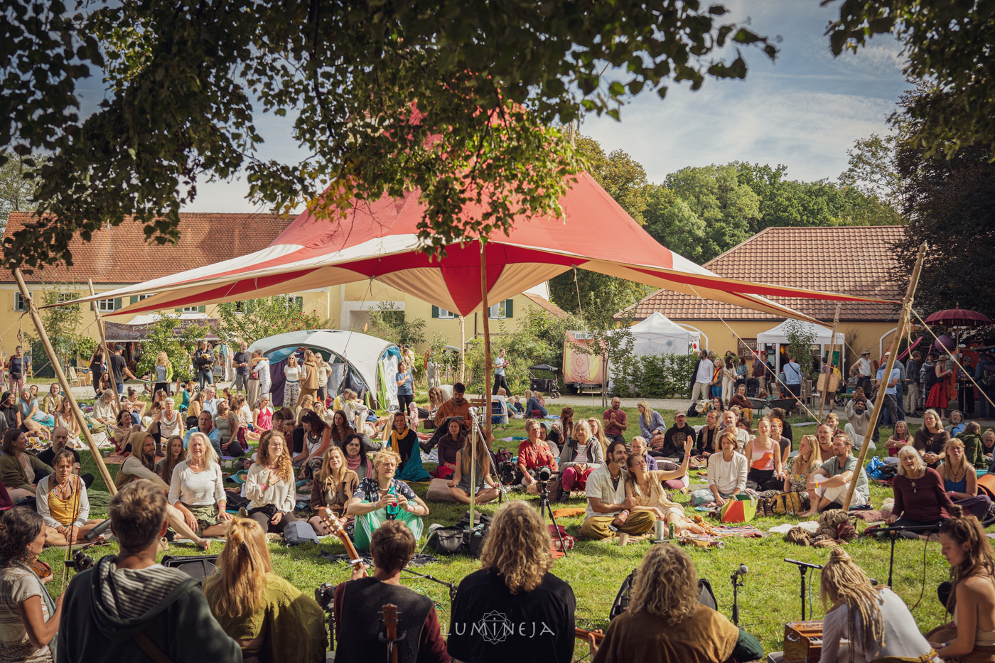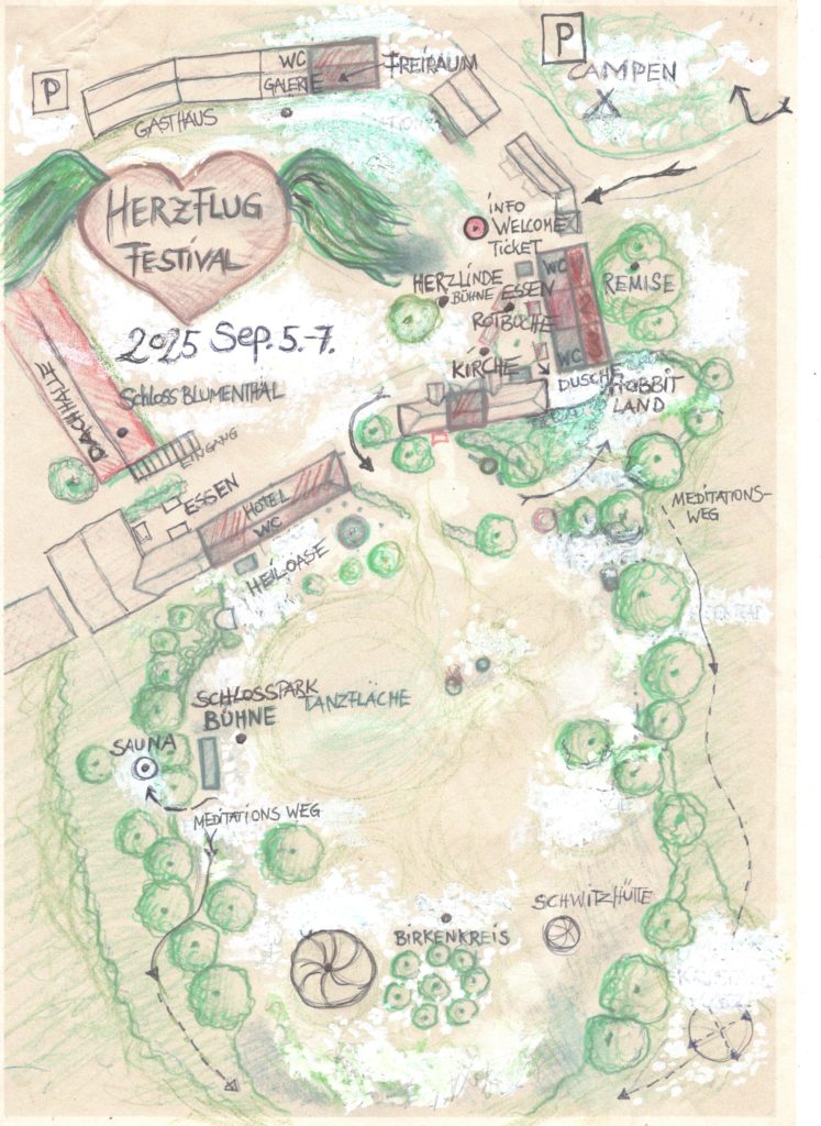 Das Herzflug Festival findet jedes Jahr im August – meistens bei Vollmond – im wilden, mystischen Park von Schloss Blumenthal statt. Auf einer großen Wiese, umrundet von alten Bäumen, wollen wir gemeinsam singen, tanzen, lachen, beten – frei sein. Eingebunden in diese einzigartige Natur, barfuss im Gras, unter freiem Himmel, feiern wir unsere Verbundenheit mit allen Wesen.