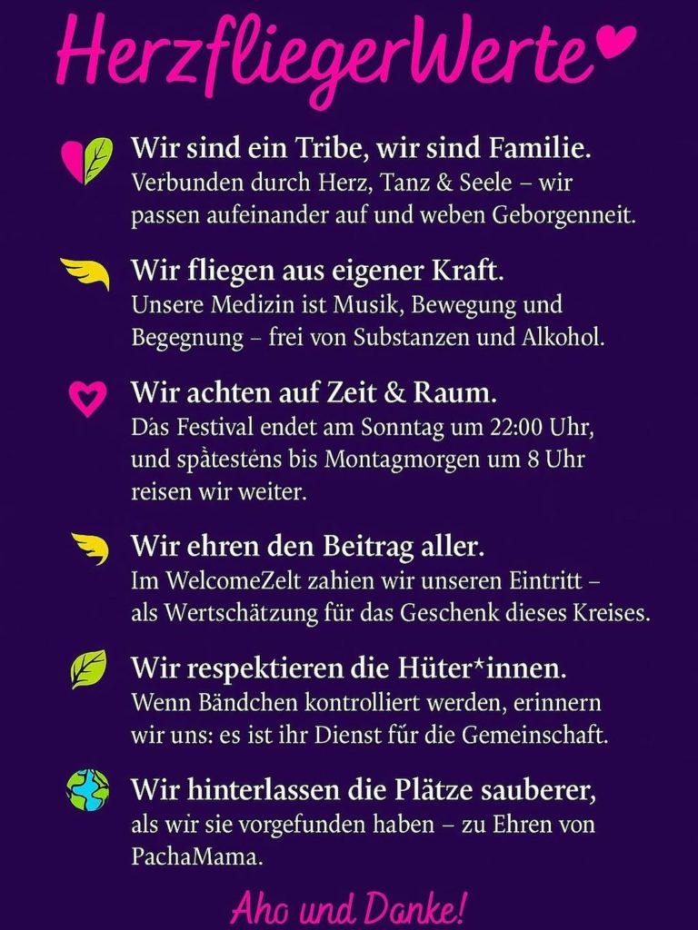 Das Herzflug Festival kannst du besuchen kommen wann du magst. Du kannst einfach nur an einem Tag vorbeischauen oder sogar nur zu den Tanzveranstaltungen. Wir empfehlen jedoch von Anfang an dabei zu sein. Du kannst Zelten oder im Gruppenraum (nur Boden vorhanden, bitte reservieren unter vish@gmx.de) übernachten. Es gibt einen eigenen Parkplatz für Camper/Busse und du kannst auch die LuxusVariante im Hotel von Schloss Blumental wählen. Da gibt’s Familien- und toll gestaltete DoppelbettZimmer (sehr schön). Also kommt wie ihr lustig seid.
